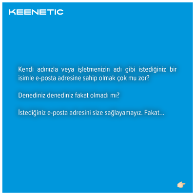Kendi adınızla ya da işletmenizin adıyla bir e-posta almak imkansız mı? E-posta almanıza yardımcı olamayız. Fakat, KeeneticOS'in sunduğu eşsiz KeenDNS adıyla ev ağınıza, dosyalarınıza ve web servislerinize dilediğiniz yerden erişmenize yardımcı olabiliriz.